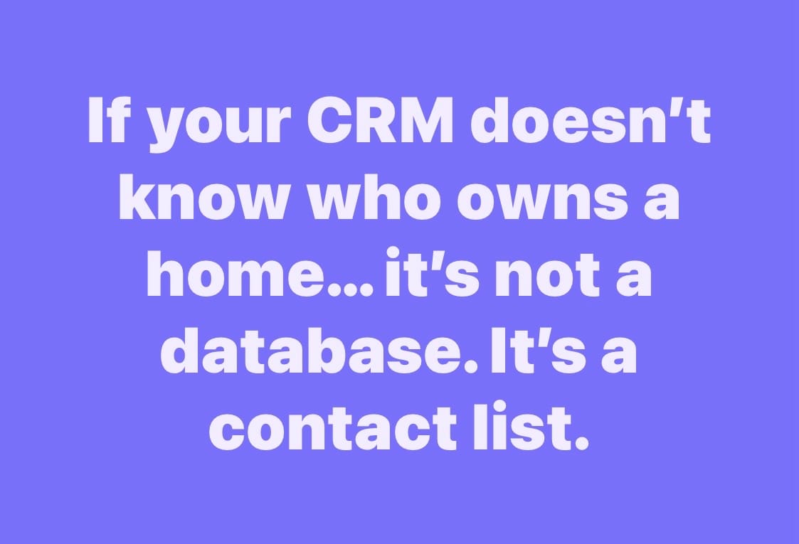 I saw the post above and the other day and it almost made me spit out my drink: “If your CRM doesn’t know who owns a home…it’s not a database. It’s a contact list.”